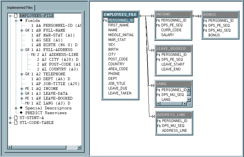 tRelational provides the unique ADABAS field to RDBMS mapping. An Imported schema (tRelationalPC ERWIN or ODBC Import) contains the physical model (e.g., tables, columns, and constraints). To establish a mapping: click on the target column, drag the column to the Implemented file area, and drop the column on the desired source ADABAS field to establish the mapping.