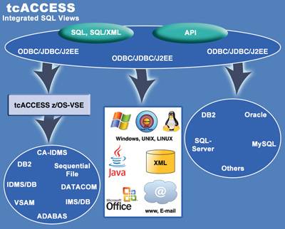 tcACCESS is a powerful integration platform (Mainframe Software, Workstation software, Middleware) for users of IBM mainframes. tcACCESS allows a transparent integration of mainframe data sources and mainframe programs into LUW applications using industry standards like SQL, ODBC, JDBC, .NET.